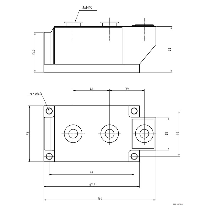 Силовой диодный модуль серии МДД RUICHI, 500 А, 12 класс представляет собой монолитную конструкцию из двух полупроводниковых диодов типа диод-диод. Устройство эксплуатируется в цепях постоянного и переменного тока с нагрузкой от 25 А до 800 А и повторяющимся обратным импульсным напряжением до 2200 В. Высокая энерготермоциклостойкость и надежная работа низкочастотных диодных модулей МДД при коммутации больших токов достигается за счет своих конструктивных особенностей и стабильных параметров гальванической развязки.
