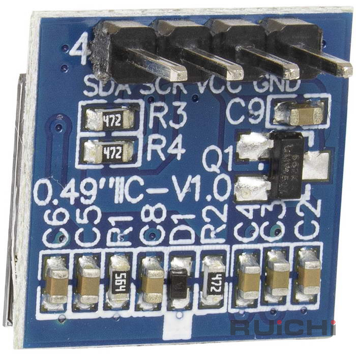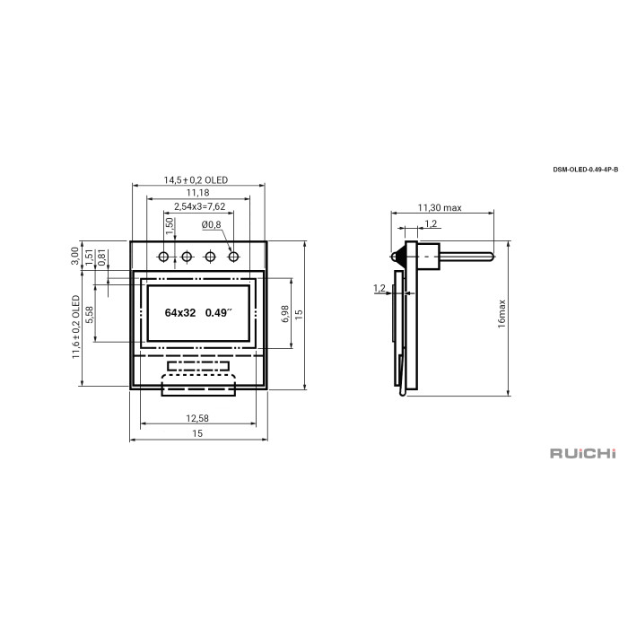Компактный 0.49" OLED-модуль RUICHI DSM-OLED-0.49-4P-B на контроллере SD1315 с разрешением 64x32 точек и белым свечением. Интерфейс I2C (4 вывода: GND, VDD, SCK, SDA), питание 3–5 В. Видимая область 12.58x6.98 мм, активная 11.18x5.58 мм, габариты 15x15x11.3 мм. Высокая контрастность, низкое энергопотребление и широкий температурный диапазон -40…+85 °C делают дисплей отличным выбором для мини-устройств, носимой электроники, IoT и DIY-проектов.