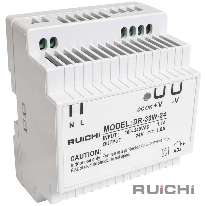 Блок питания на DIN-рейку RUICHI DR-30-24, 100-240 В (АС) 1,25 А, 24 В, в пластиковом корпусе представляет собой преобразователь из напряжения переменного тока (AC) в напряжение постоянного тока (DC) большой мощности модульного типа. Отличительными особенностями импульсных блоков питания на на DIN-рейку является, высокая мощность и отказоустойчивость, и широкий диапазон рабочей температуры - от -30 до +70 °С.
