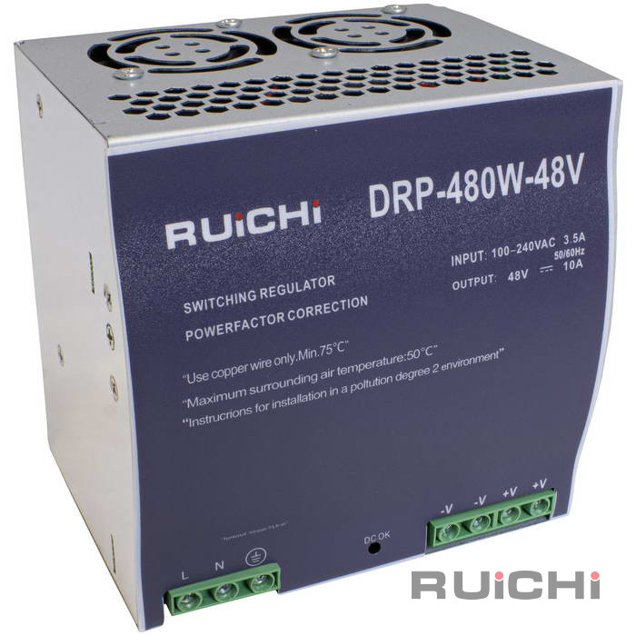 Блок питания на DIN-рейку RUICHI DRP-480-48, 100-240 В (АС) 10 А, 48 В, в металлическом корпусе представляет собой преобразователь из напряжения переменного тока (AC) в напряжение постоянного тока (DC) большой мощности модульного типа. Отличительными особенностями импульсных блоков питания на на DIN-рейку является, высокая мощность и отказоустойчивость, и широкий диапазон рабочей температуры - от -30 до +70 °С.