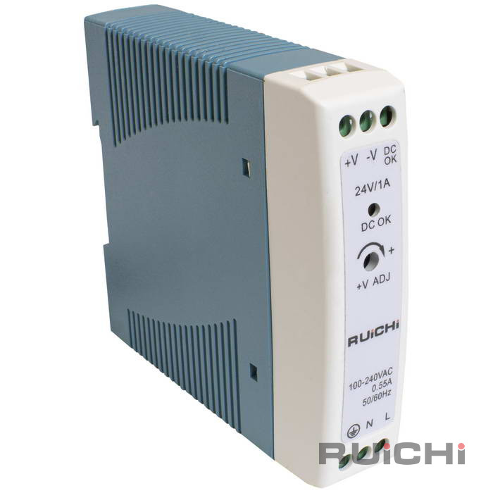 Блок питания на DIN-рейку RUICHI MDR-20-24, 100-240 В (АС) 0,83 А, 24 В, в пластиковом корпусе представляет собой преобразователь из напряжения переменного тока (AC) в напряжение постоянного тока (DC) большой мощности модульного типа. Отличительными особенностями импульсных блоков питания на на DIN-рейку является, высокая мощность и отказоустойчивость, и широкий диапазон рабочей температуры - от -30 до +70 °С.