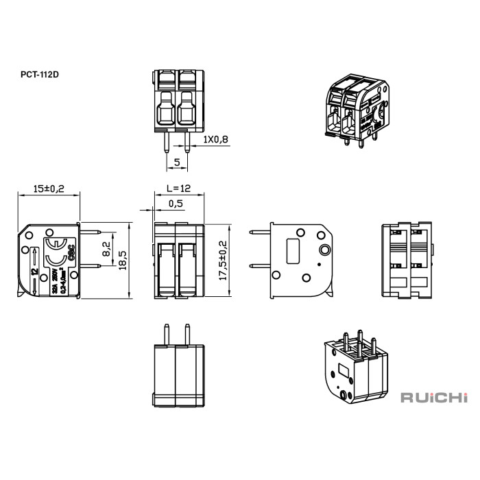 Клемма зажимная соединительная безвинтовая RUICHI PCT-112D, 2-проводная, 32 А, 250 В, 0.2...4.0мм2, -20…+105 °C, PA66 UL94V-0, монтаж на плату – это навесная клеммная колодка, используемая при электромонтажных работахдля коммутации зачищенных или оконцованных проводов.