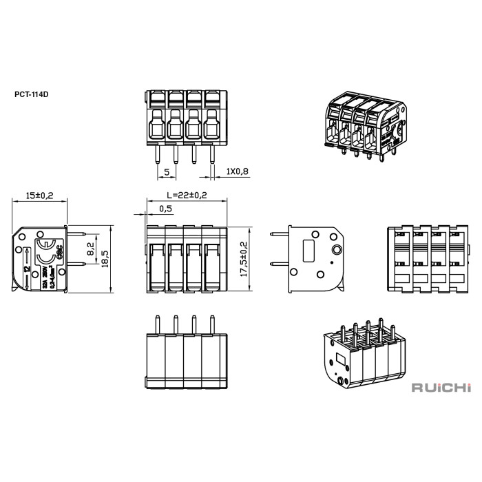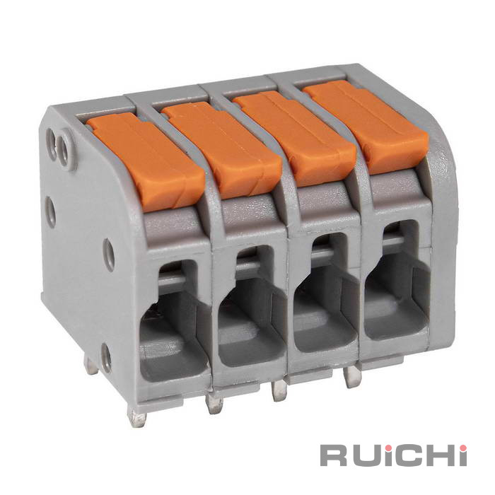 Клемма зажимная соединительная безвинтовая RUICHI PCT-114D, 4-проводная, 32 А, 250 В, 0.2...4.0мм2, -20…+105 °C, PA66 UL94V-0, монтаж на плату – это навесная клеммная колодка, используемая при электромонтажных работах для коммутации зачищенных или оконцованных проводов.