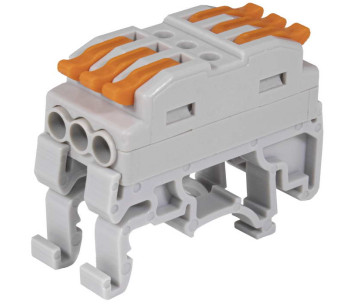 Зажим-клемма RUICHI СМК 222-425D, 5 контактов, 24 А, 250 В, на DIN-рейку, корпус PA66 – это навесная клеммная колодка, используемая при электромонтажных работах для соединения проводов.