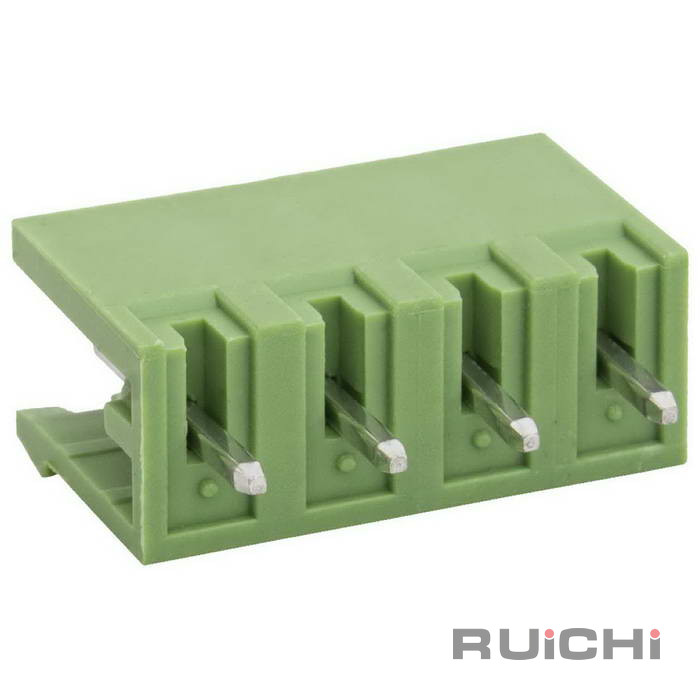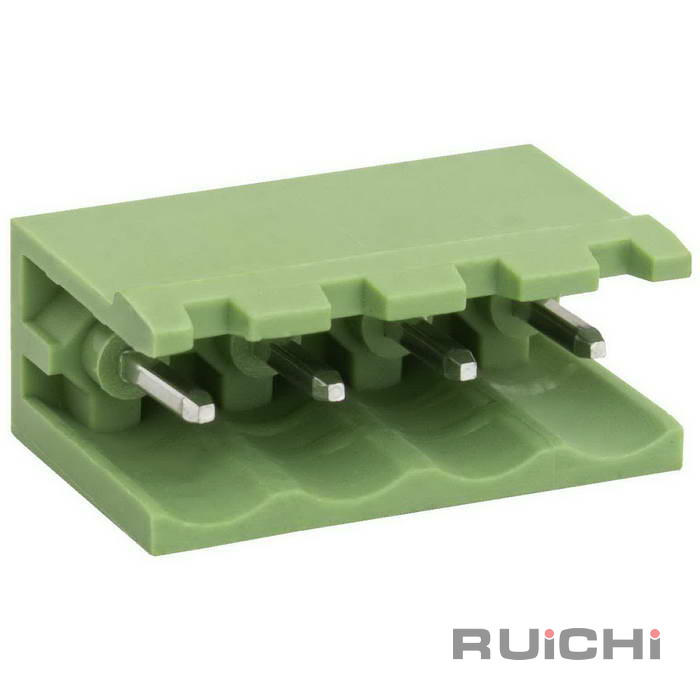 Клеммник разъемный прямой, вилка (M) RUICHI XY2500V-A-04P, 4 контакта с шагом 5,0 мм, 12 А, 2,5 мм?, -40…+100 °С, PA66 – это конструкции, состоящие из 2-х частей. Одна из которых крепится на плате, а вторая – непсредственно на кабеле. Для соединения подвижная часть клеммника вставляется в неподвижную и фиксируется зажимной пластиной.
