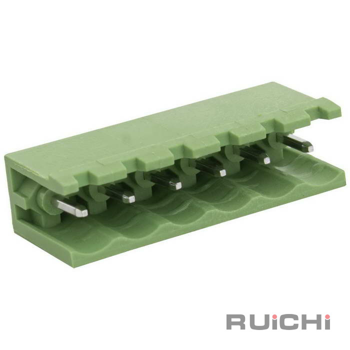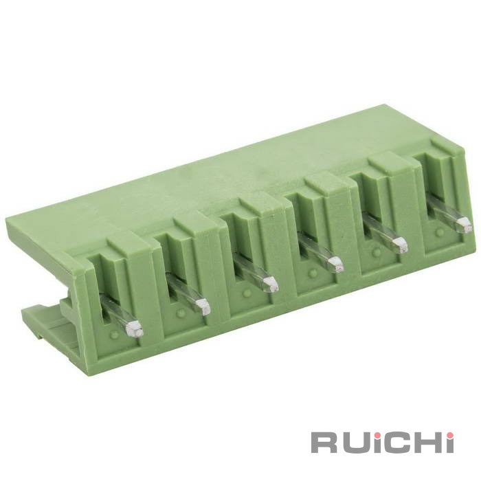 Клеммник разъемный прямой, вилка (M) RUICHI XY2500V-A-06P, 6 контактов с шагом 5,0 мм, 12 А, 2,5 мм?, -40…+100 °С, PA66 – это конструкции, состоящие из 2-х частей. Одна из которых крепится на плате, а вторая – непсредственно на кабеле. Для соединения подвижная часть клеммника вставляется в неподвижную и фиксируется зажимной пластиной.