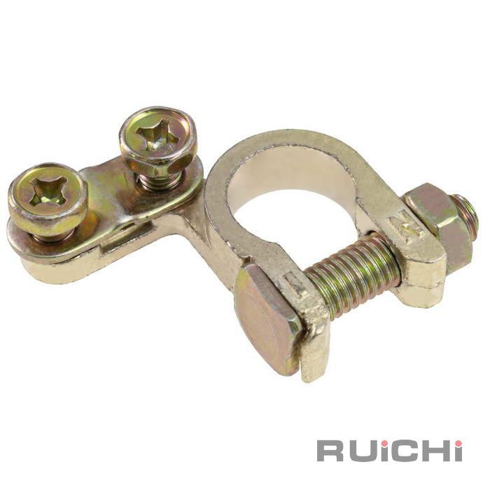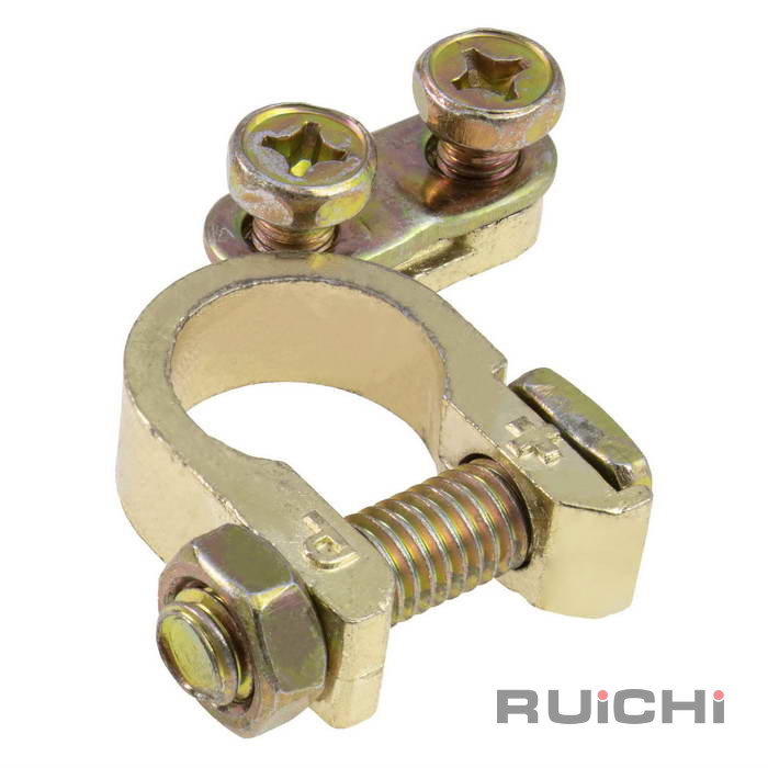 Клеммы аккумуляторные переходные RUICHI CHA008, 2 штуки в комплекте, диаметр разъема 16 мм, латунь - это электрические контакты, используемые для подключения нагрузки или зарядного устройства к одноэлементной или многоэлементной аккумуляторной стартерной батареи.