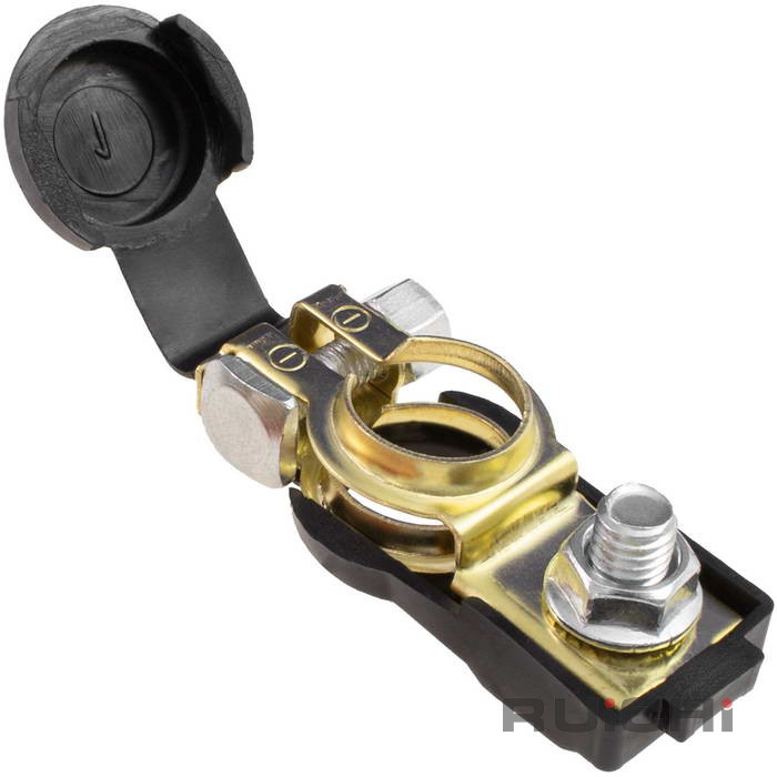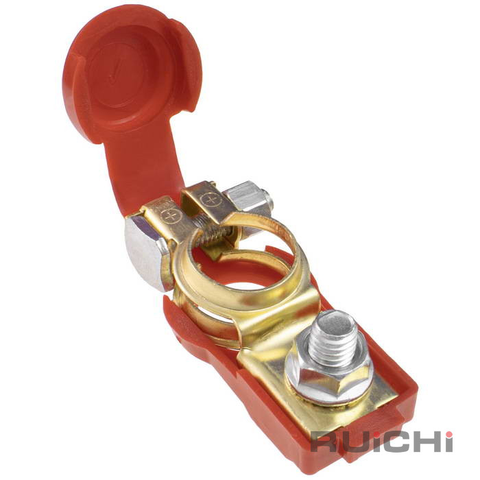 Клеммы аккумуляторные переходные RUICHI CHA009, 2 штуки в комплекте, диаметр разъема 17 мм, латунь, корпуса пластиковые, красный/черный - это электрические контакты, используемые для подключения нагрузки или зарядного устройства к одноэлементной или многоэлементной аккумуляторной стартерной батареи.