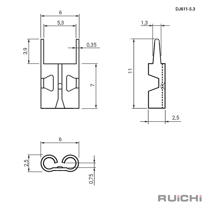 Клемма ножевая на плату RUICHI DJ611-5.3 мм предназначена для быстрого соединения проводников, клеммников и терминалов, а также для соединения кабелей одинаковых или разных разъёмов между собой. Такие клеммы для быстрого соединения служит для обеспечения разборного качественного контактного соединения проводников с различным сечением. Сами ножевые клеммы могут быть медными, бронзовыми или лужеными.