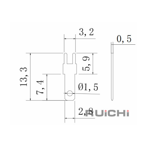 Клемма ножевая на плату RUICHI DJ614-2.8 предназначена для быстрого соединения проводников, клеммников и винтовых терминалов, а также для соединения кабелей одинаковых или разных разъёмов между собой. Такие клеммы для быстрого соединения служит для обеспечения разборного качественного контактного соединения проводников с различным сечением. Сами ножевые клеммы могут быть медными, бронзовыми или лужеными, а так же могут выпускаться с изоляционной манжетой или гильзой. Материал изоляции – самозатухающий поливинилхлорид (ПВХ). Возможные варианты цветности изоляционных гильз наконечников – красный, синий, желтый.