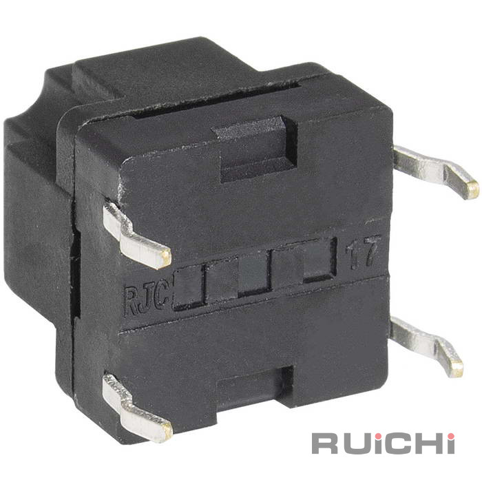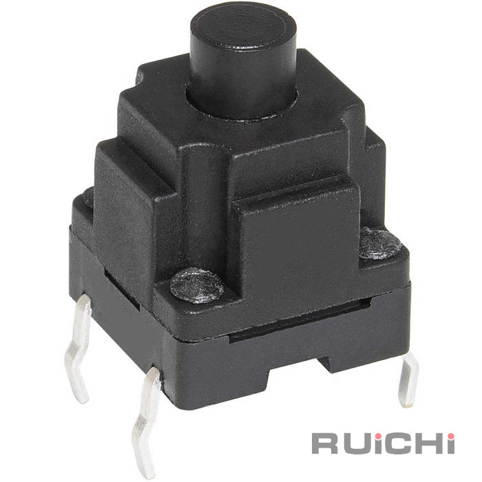 Тактовая кнопка RUICHI KAN1010-1301B, 10x10x13 мм – это разновидность простейших механических выключателей, обеспечивающая замыкание контактов (без фиксации) только при наличии давления на поверхность штока (толкателя).