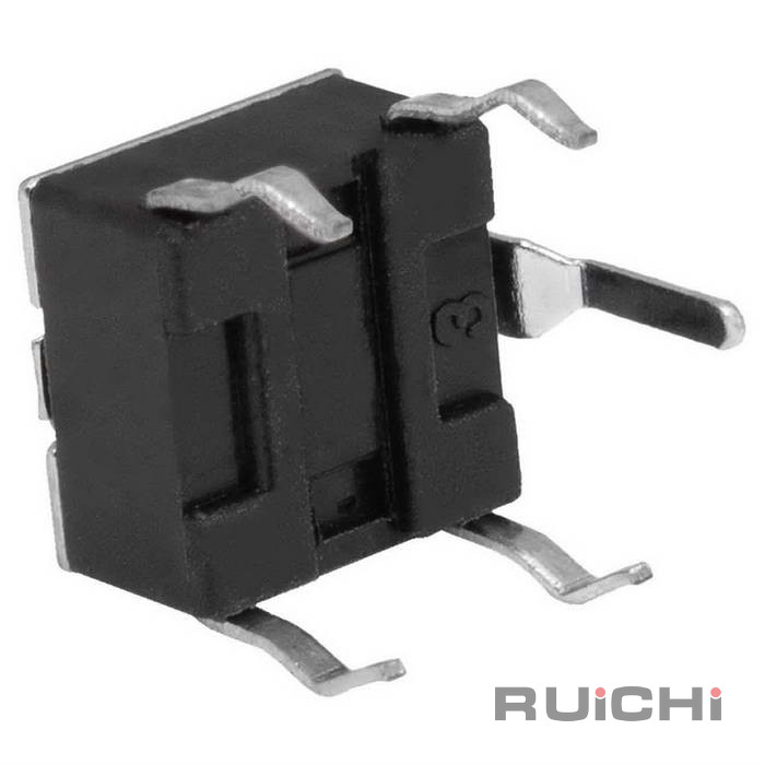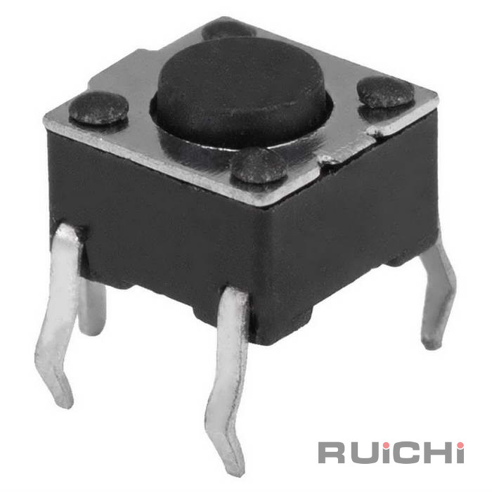 Тактовая кнопка RUICHI KAN0621-0431B, 6x6x4.3 мм, OFF-(ON), 50 мА, 12 В, 100 мОм – это разновидность простейших механических выключателей, обеспечивающая замыкание контактов (без фиксации) только при наличии давления на поверхность штока (толкателя).