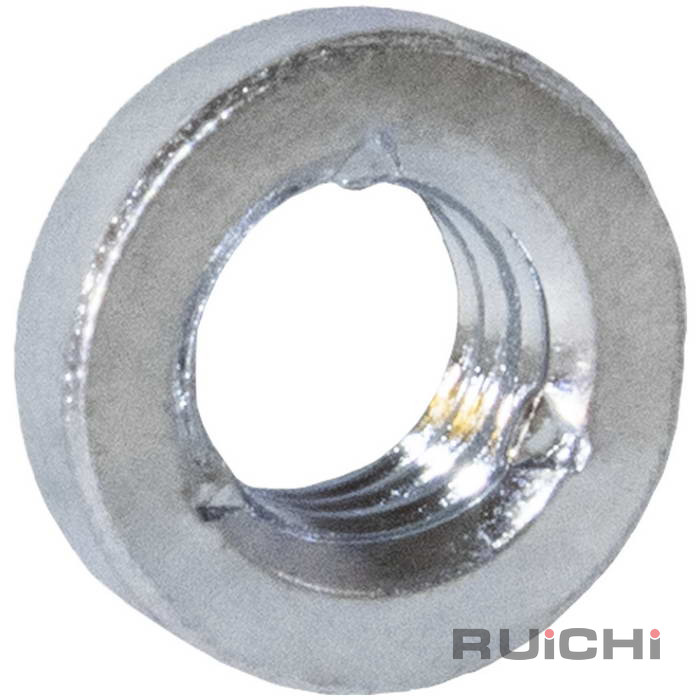Гайка резьбовая запрессовочная самоконтрящаяся SL-M5-2 RUICHI применяется для создания резьбовой точки крепления в тонколистовом металле. Стопорение резьбы осуществляется за счет увеличенной силы трения в резьбовой паре, полученной из-за деформации резьбового отверстия обжатием в трёх точках. При монтаже с помощью пресса (без удара) установочная часть гайка полностью утапливается в листовой материал с обратной стороны. Деформируемый металл, при этом, затекает в кольцевую канавку на втулке, что обеспечивает надёжную фиксацию втулки в металле.