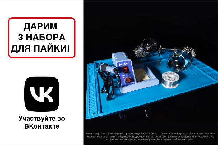 RUICHI запускает розыгрыш среди заказчиков, посетителей сайта и подписчиков официального сообщества ВКонтакте. Разыгрывается профессиональный набор для пайки, включающий паяльную станцию SM-936D, штатив с лупой TS-36, термостойкий силиконовый коврик и припой Sn/Pb 40/60 с флюсом.