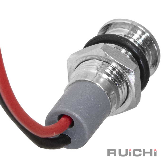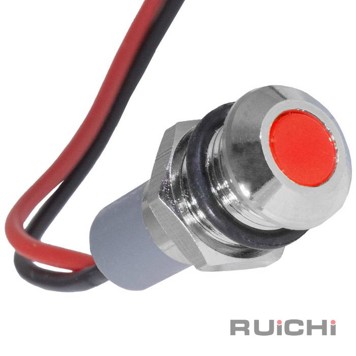 Индикатор антивандальный RUICHI GQ6WF-R, цвет красный, точечный излучатель, 12-24 В, 15 мА, гибкие выводы, никелированная латунь - это источник света для демонстрации электрических процессов в приборах. Конструктивно представляет собой модуль индикации, оснащенный контактным блоком, к которому припаиваются или присоединяются проводники.