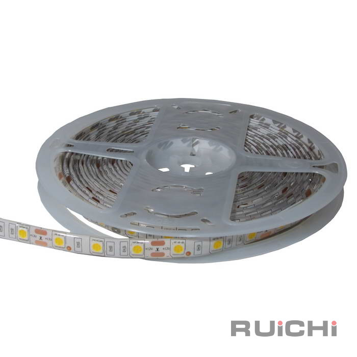 Светодиодная лента RUICHI, 5050, 300 LED, IP65, 12 В, цвет белый тёплый, катушка 5 м - это источник света, собранный на основе светодиодов. Представляет собой светодиодный модуль на гибкой печатной (монтажной) плате, на которой равноудалённо друг от друга расположены светодиоды.