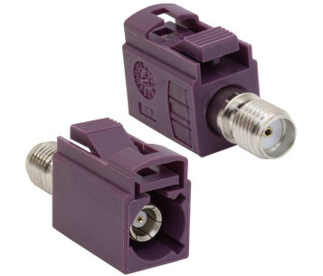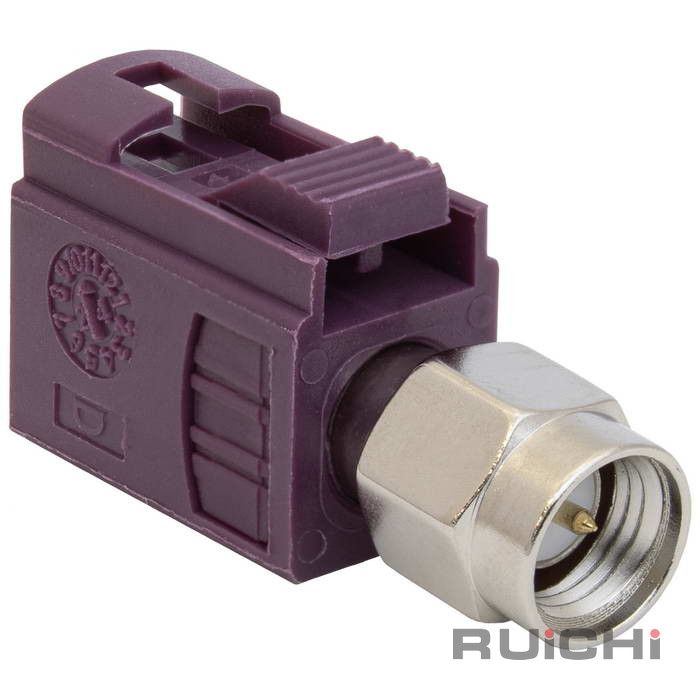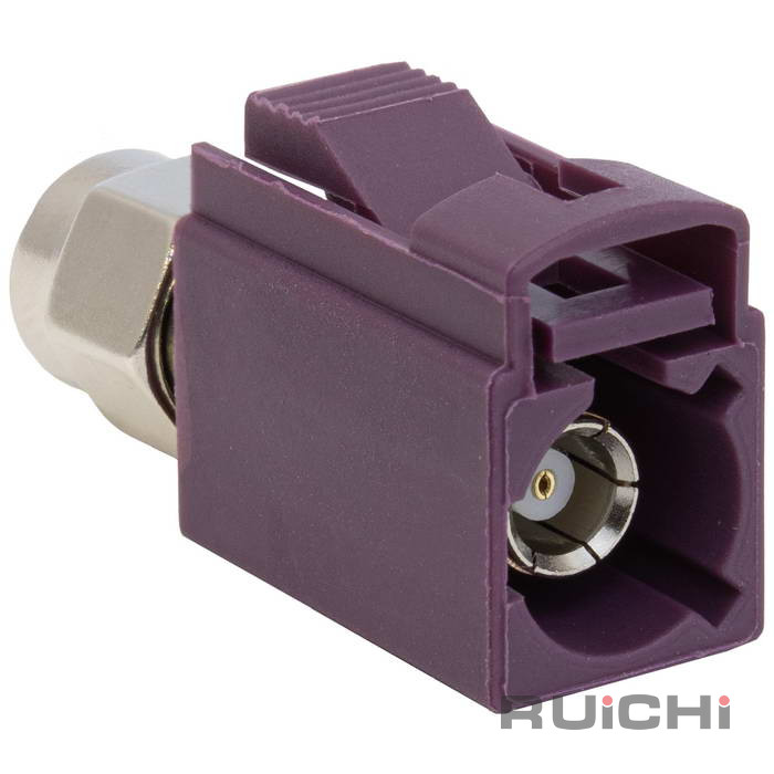 Высокочастотный разъем RUICHI серии FAKRA TYPE D-J (розетка) / SMA-P (вилка) для коммутации оборудования GSM, обжимной, на кабель RG174/RG316, 5000 МОм, -40…+105 °C, цвет корпуса фиолетовый (RAL 4004)