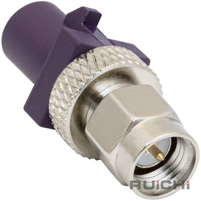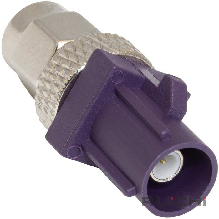 Высокочастотный разъем RUICHI серии FAKRA TYPE D-P (вилка)/ SMA-P (вилка) для коммутации оборудования GSM, обжимной, на кабель RG174/RG316, 5000 МОм, -40…+105 °C, цвет корпус фиолетовый (RAL 4004)