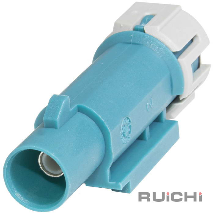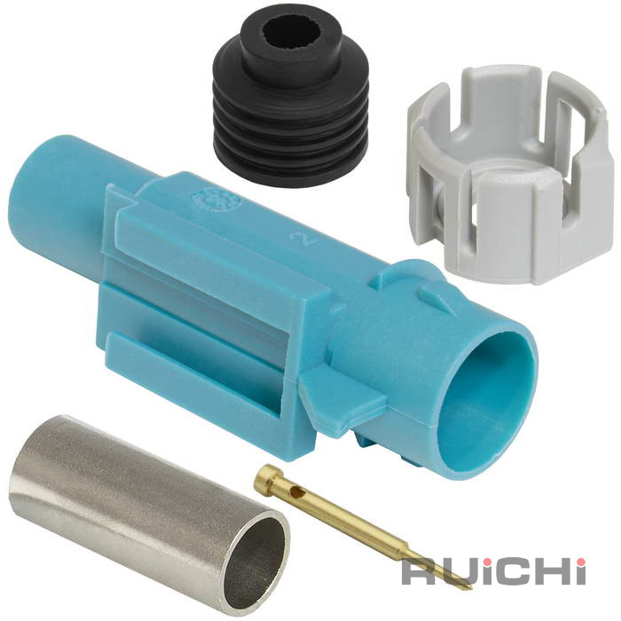 Высокочастотный универсальный разъем RUICHI серии FAKRA TYPE Z-P (вилка) для коммутации любого оборудования, обжимной, на кабель RG174/RG316, 5000 МОм, -40…+105 °C, цвет корпуса бирюзовый (RAL 5021)