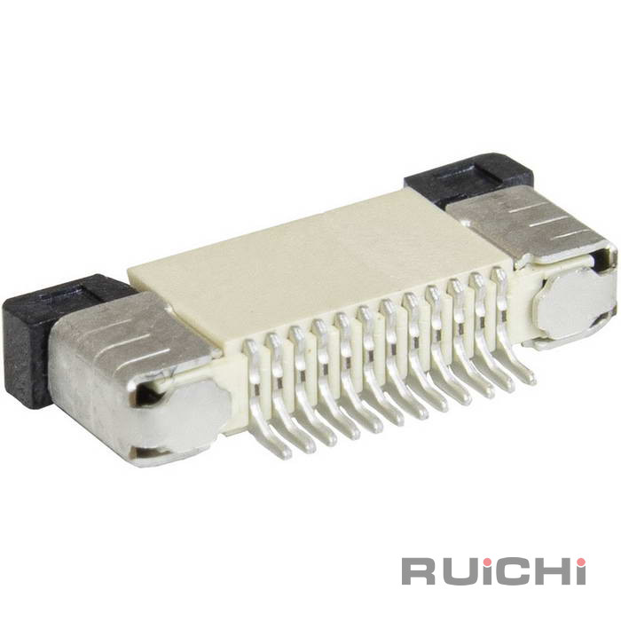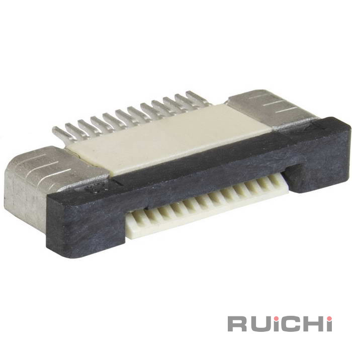 FPC/FFC разъем для гибких плоских печатных шлейфов и печатных плат RUICHI, шаг контактов 0.5 мм, 12 контактов, 0.5 А, 50 В, 50 МОм, корпус полистирол UL94V-0, монтаж на плату, под пайку имеет функцию ручной и автоматической блокировки, которая может соединять шлейф и разъём одним касанием, что делает такой разъем для плоских гибких кабелей и плоских печатных схем более надежным и долговечным. FPC/FFC разъемы также могут иметь опцию экранирования от электромагнитных помех на 360 градусов и поддерживают высокоскоростную передачу данных, а также работают с высокими температурами до 125 °C.