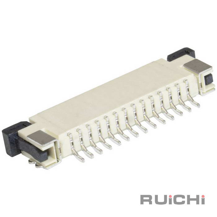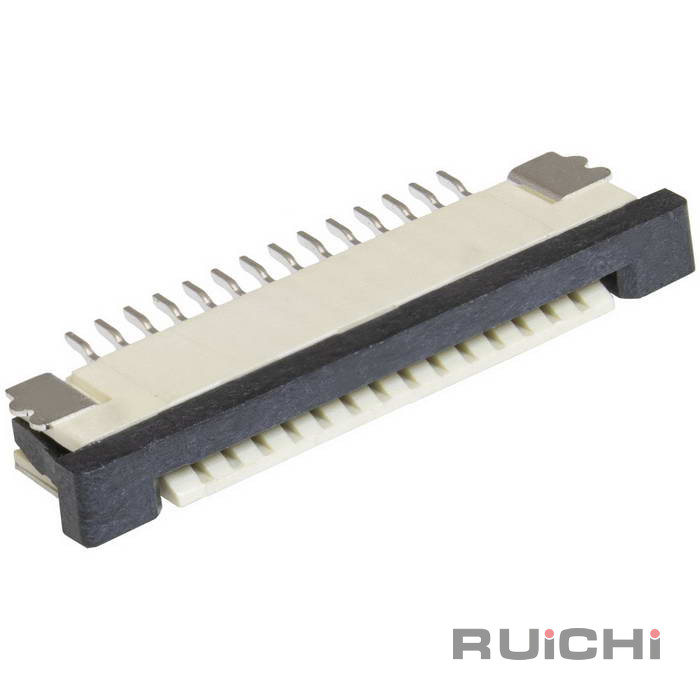 FPC/FFC разъем для гибких плоских печатных шлейфов и печатных плат RUICHI, шаг контактов 1.0 мм, 14 контактов, 0.5 А, 50 В, 50 МОм, корпус полистирол UL94V-0, монтаж на плату, под пайку имеет функцию ручной и автоматической блокировки, которая может соединять шлейф и разъём одним касанием, что делает такой разъем для плоских гибких кабелей и плоских печатных схем более надежным и долговечным. FPC/FFC разъемы также могут иметь опцию экранирования от электромагнитных помех на 360 градусов и поддерживают высокоскоростную передачу данных, а также работают с высокими температурами до 125 °C.