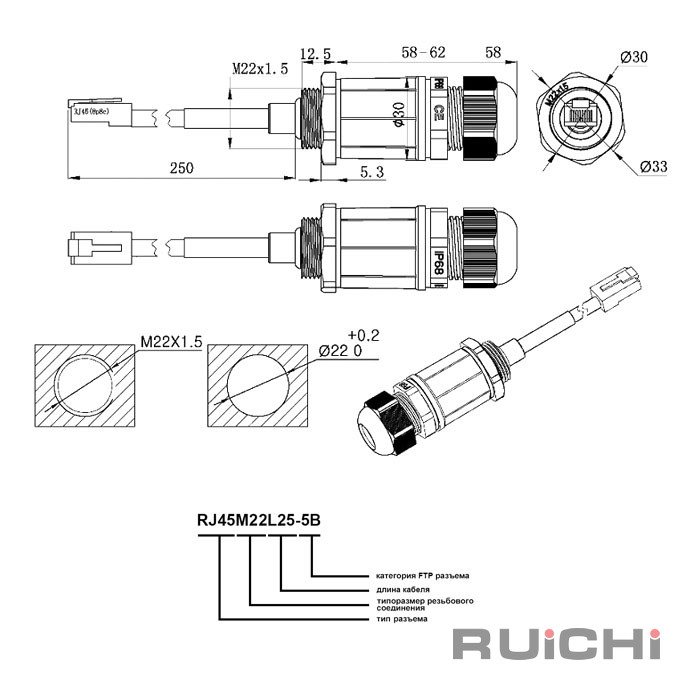 Разъём герметичный RUICHI RJ45M22L25-5B