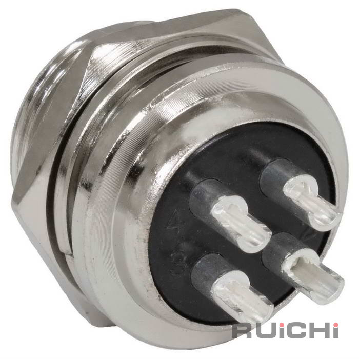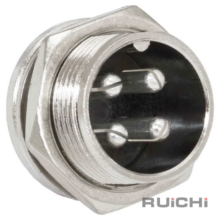 Разъём цилиндрический малогабаритный RUICHI GX16M-4C, 4 контакта представляет собой коннектор ручного соединения, внутреннего объемного монтажа. Он соединяет цепи с нагрузкой до 10 А и 200 В. Корпус соединителей изготовляется из цинка и никеля, а внутренний изолятор из бакелита. Разъемы являются пылезащищенными и соответствуют степени защиты IP 55, что гарантирует работу в пыльной среде и допускает попадания брызг воды.