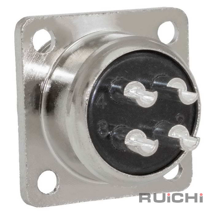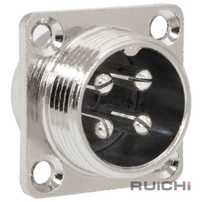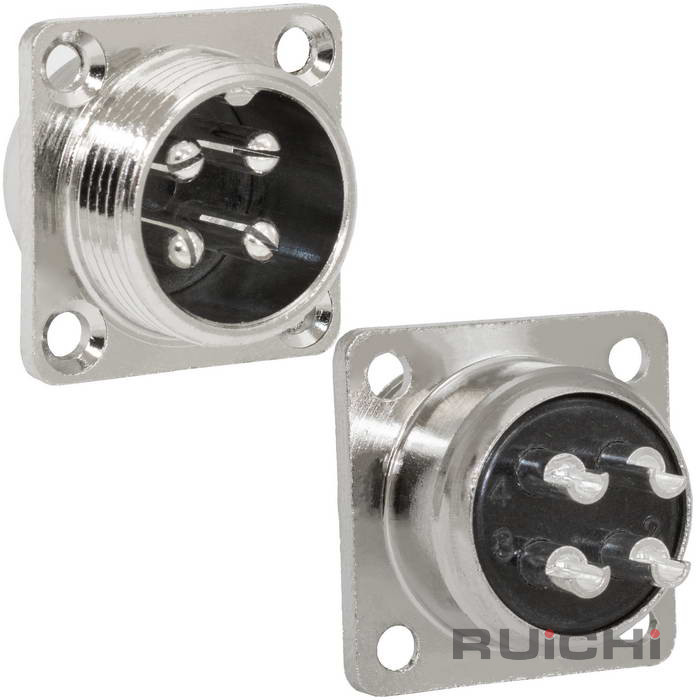 Разъём цилиндрический малогабаритный RUICHI GX16M-4F, 4 контакта представляет собой коннектор ручного соединения, внутреннего объемного монтажа. Он соединяет цепи с нагрузкой до 10 А и 200 В. Корпус соединителей изготовляется из цинка и никеля, а внутренний изолятор из бакелита. Разъемы являются пылезащищенными и соответствуют степени защиты IP 55, что гарантирует работу в пыльной среде и допускает попадания брызг воды.