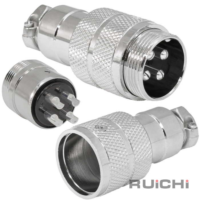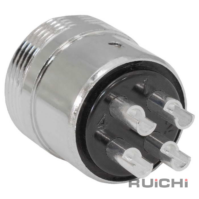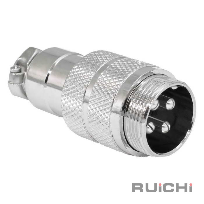 Разъём цилиндрический малогабаритный RUICHI GX20M-4, 4 контакта представляет собой коннектор ручного соединения, внутреннего объемного монтажа. Он соединяет цепи с нагрузкой до 10 А и 200 В. Корпус соединителей изготовляется из цинка и никеля, а внутренний изолятор из бакелита. Разъемы являются пылезащищенными и соответствуют степени защиты IP 55, что гарантирует работу в пыльной среде и допускает попадания брызг воды.
