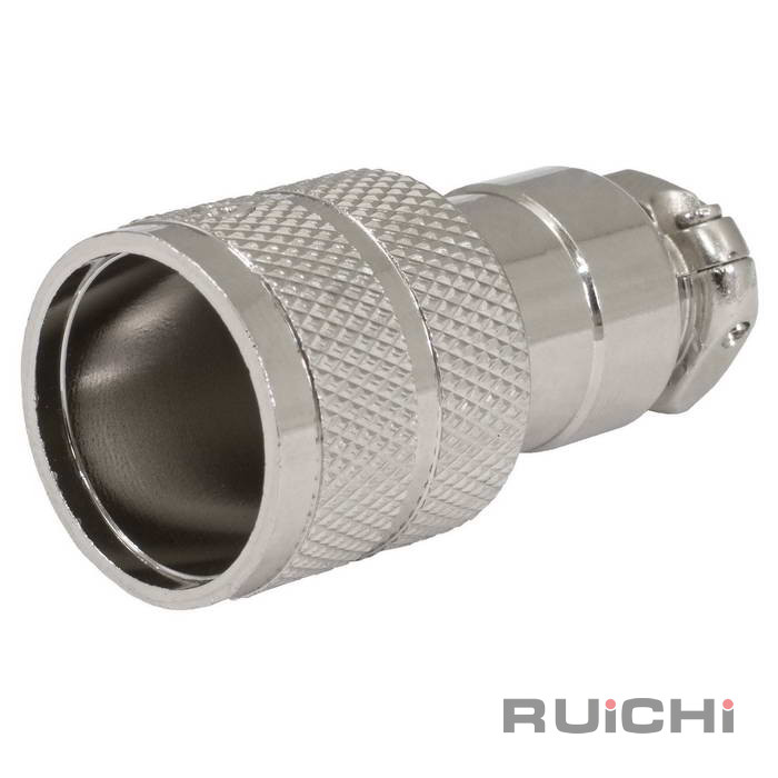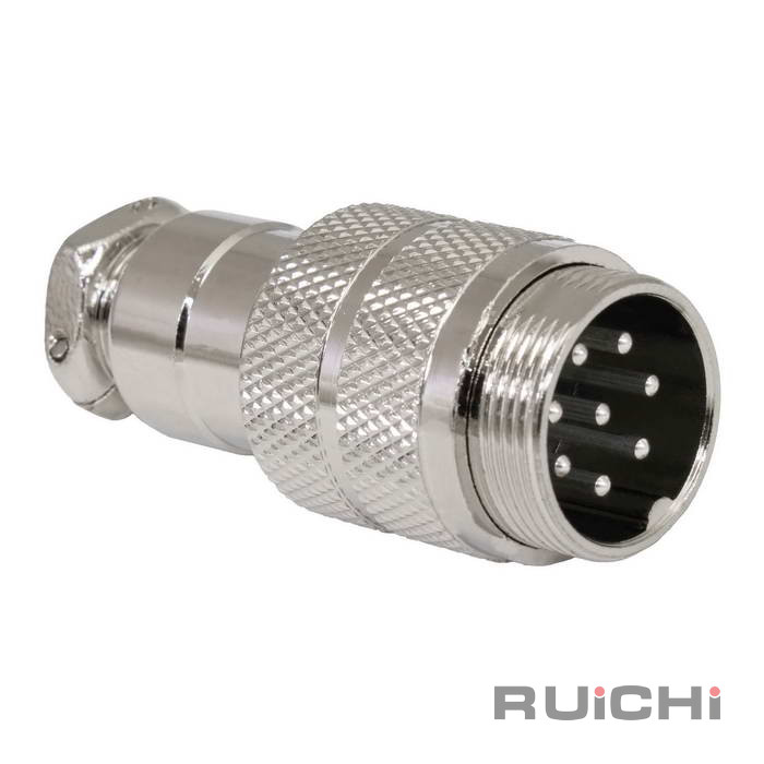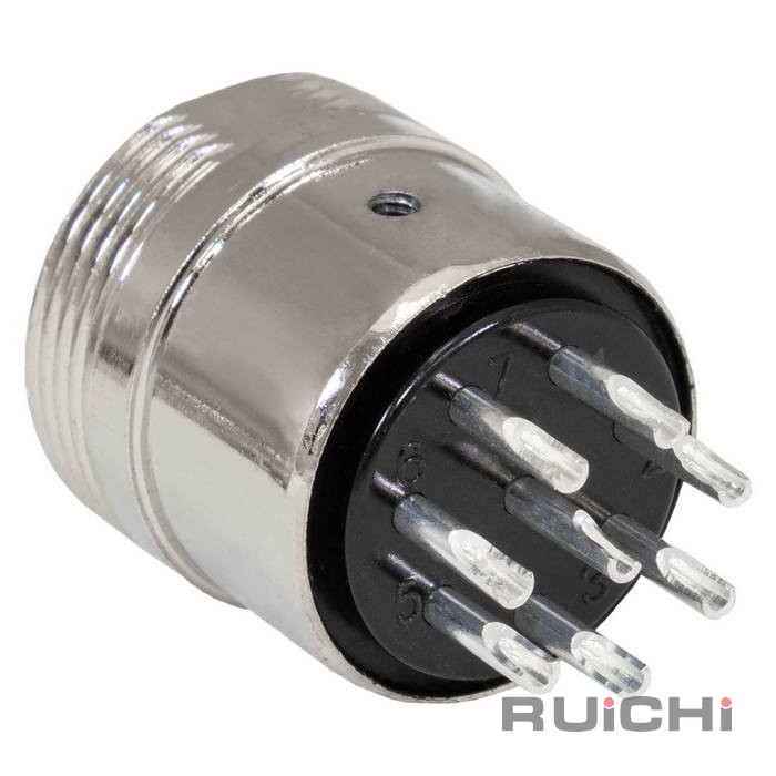 Разъём цилиндрический малогабаритный RUICHI GX20M-8, 8 контактов представляет собой коннектор ручного соединения, внутреннего объемного монтажа. Он соединяет цепи с нагрузкой до 10 А и 200 В. Корпус соединителей изготовляется из цинка и никеля, а внутренний изолятор из бакелита. Разъемы являются пылезащищенными и соответствуют степени защиты IP 55, что гарантирует работу в пыльной среде и допускает попадания брызг воды.