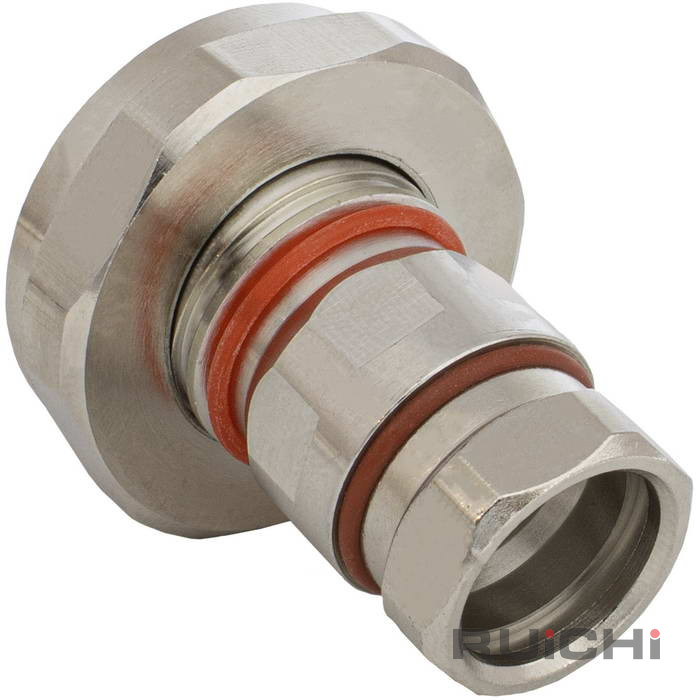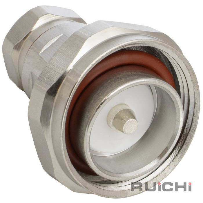 Высокочастотный разъем 7/16 DIN (вилка) RUICHI 25-P012U, 7.5 ГГц, 50 Ом, IP68, -40...+85 °C, монтаж на кабель, тип кабеля SCF-12-50, РК 50-9-35, корпус/контакт латунь – это коаксиальный коннектор большого размера с резьбовым соединением. Обозначение 7/16 происходит от метрических размеров рабочей поверхности контактов соединителя: 7 мм наружного диаметра внутреннего контакта и 16 мм внутреннего диаметра внешнего контакта.