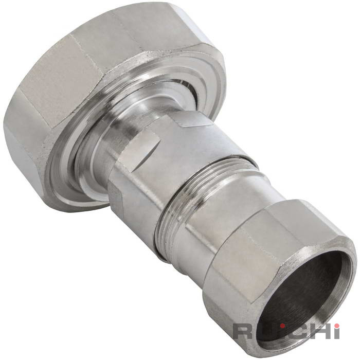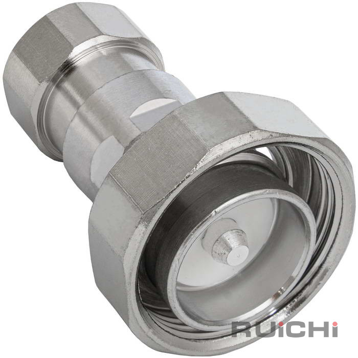 Высокочастотный разъем 7/16 DIN (вилка) RUICHI 25-P012V, 4 ГГц, 50 Ом, IP68, -40...+85 °C, монтаж на кабель, тип кабеля РК 50-12-33, корпус/контакт латунь – это коаксиальный коннектор большого размера с резьбовым соединением. Обозначение 7/16 происходит от метрических размеров рабочей поверхности контактов соединителя: 7 мм наружного диаметра внутреннего контакта и 16 мм внутреннего диаметра внешнего контакта.