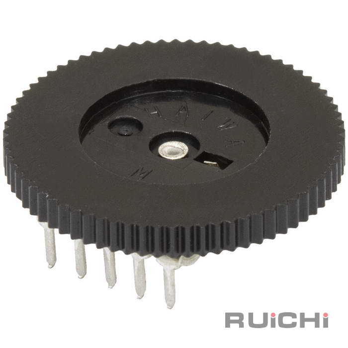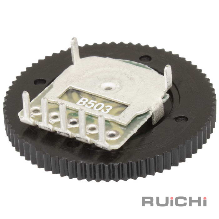 Дуплексный зубчатый потенциометр (переключатель громкости) RUICHI B503, 50 кОм, 1 А, 50 В/12 В, 5 контактов, корпус: толщина 2 мм, диаметр 20 мм используются при многократных регулировках аппаратуры, обладают большой износоустойчивостью.