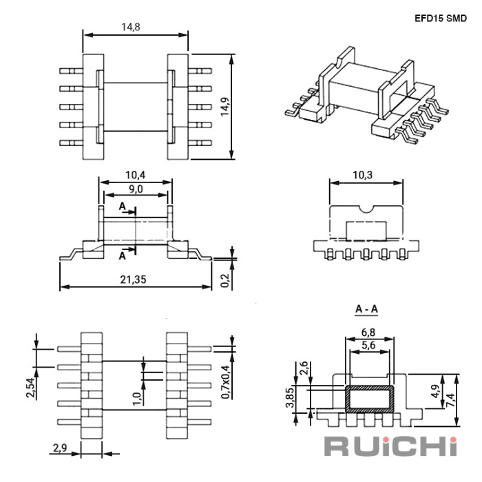Каркас для катушки RUICHI EFD15 SMD количество выводов 10 монтаж SMD играет важную роль, он обеспечивает механическую прочность, фиксирует форму обмотки, а в случае использования ферритового сердечника может влиять на электрические параметры.