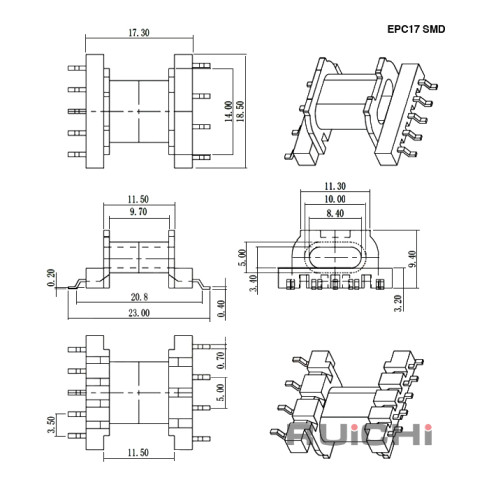 Каркас для катушки RUICHI EPC17 SMD количество выводов 9 монтаж SMD играет важную роль, он обеспечивает механическую прочность, фиксирует форму обмотки, а в случае использования ферритового сердечника может влиять на электрические параметры.