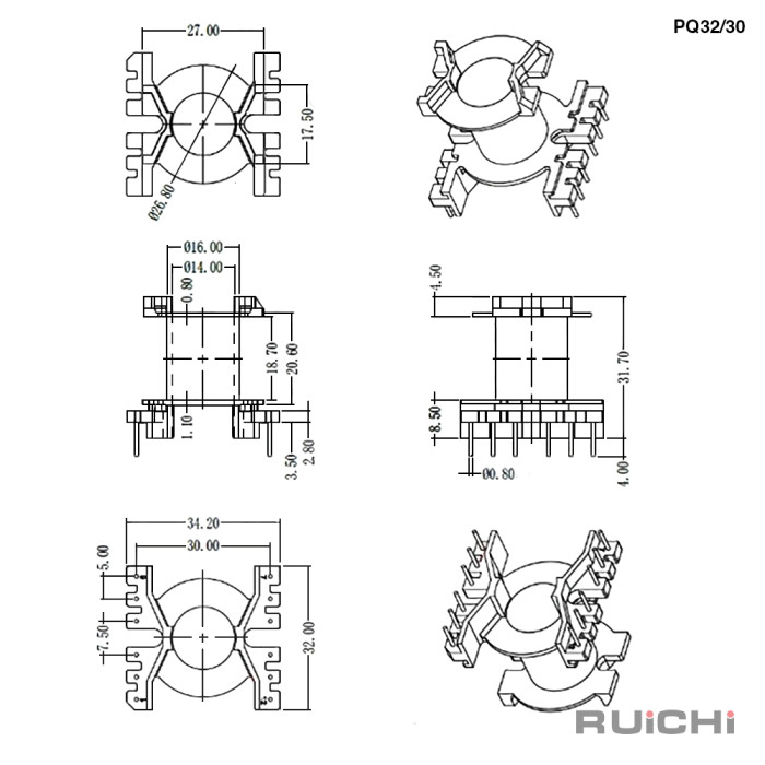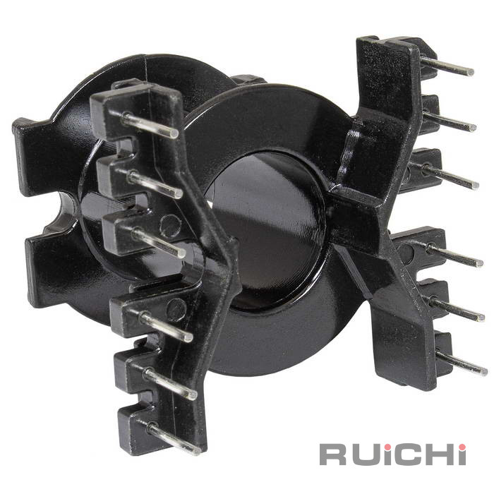 Каркас для катушки RUICHI PQ32/30 количество выводов 12 монтаж THT играет важную роль, он обеспечивает механическую прочность, фиксирует форму обмотки, а в случае использования ферритового сердечника может влиять на электрические параметры.