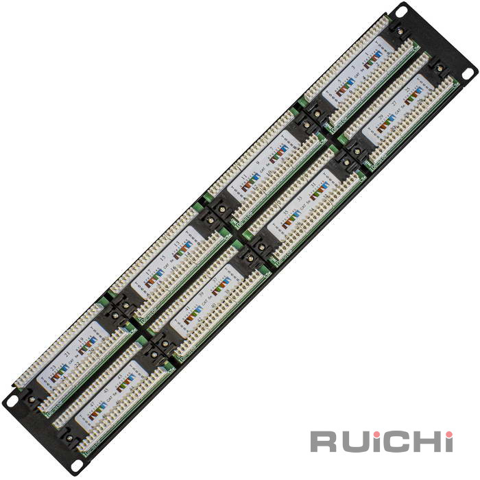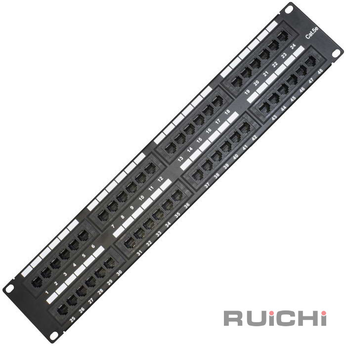 Патч-панель RUICHI RH-PP2U48U5E предназначена, для коммутации активного сетевого оборудования с портами рабочих компьютеров (или другого оборудования), а также для использования в паре с другой патч-панелью (так называемое двойное представление портов), где первая представляет порты активного сетевого оборудования, а вторая – порты присоединяемых устройств (компьютеров, телефонов, сетевых принтеров и т.п.). Разъемы пронумерованы, имеют площадки для дополнительной маркировки. Контакты, расположенные на обратной стороне также имеют цифровую и цветовую маркировку.