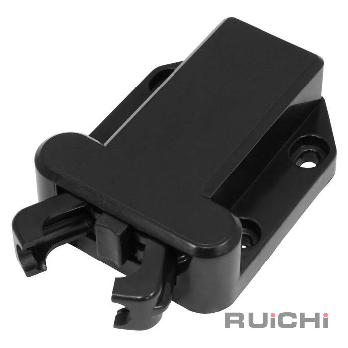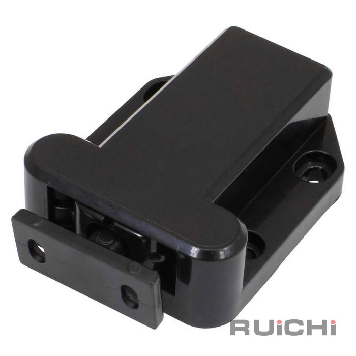 Замок с защелкой, нажимной RUICHI BXY144, корпус черный, материал платик, с поверхностным креплением на саморезы представляет собой защитный механизм для почтового ящика, распределительного щита электросчётчиков или пластикого бокса для электрооборудования. Конструкция , запорного механизма врезная. Изнутри механизм замка фиксируется с помощью гайки.